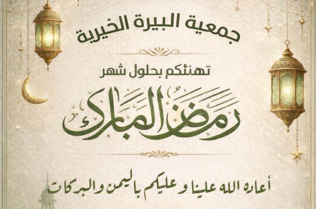 تتقدّم أسرة جمعية البيرة الخيرية بأصدق مشاعر التهنئة والتبريك إلى أبناء مجتمعنا الكريم، وإلى الأمتين العربية والإسلامية، بمناسبة حلول شهر رمضان المبارك، شهر الرحمة والمغفرة والبركات.